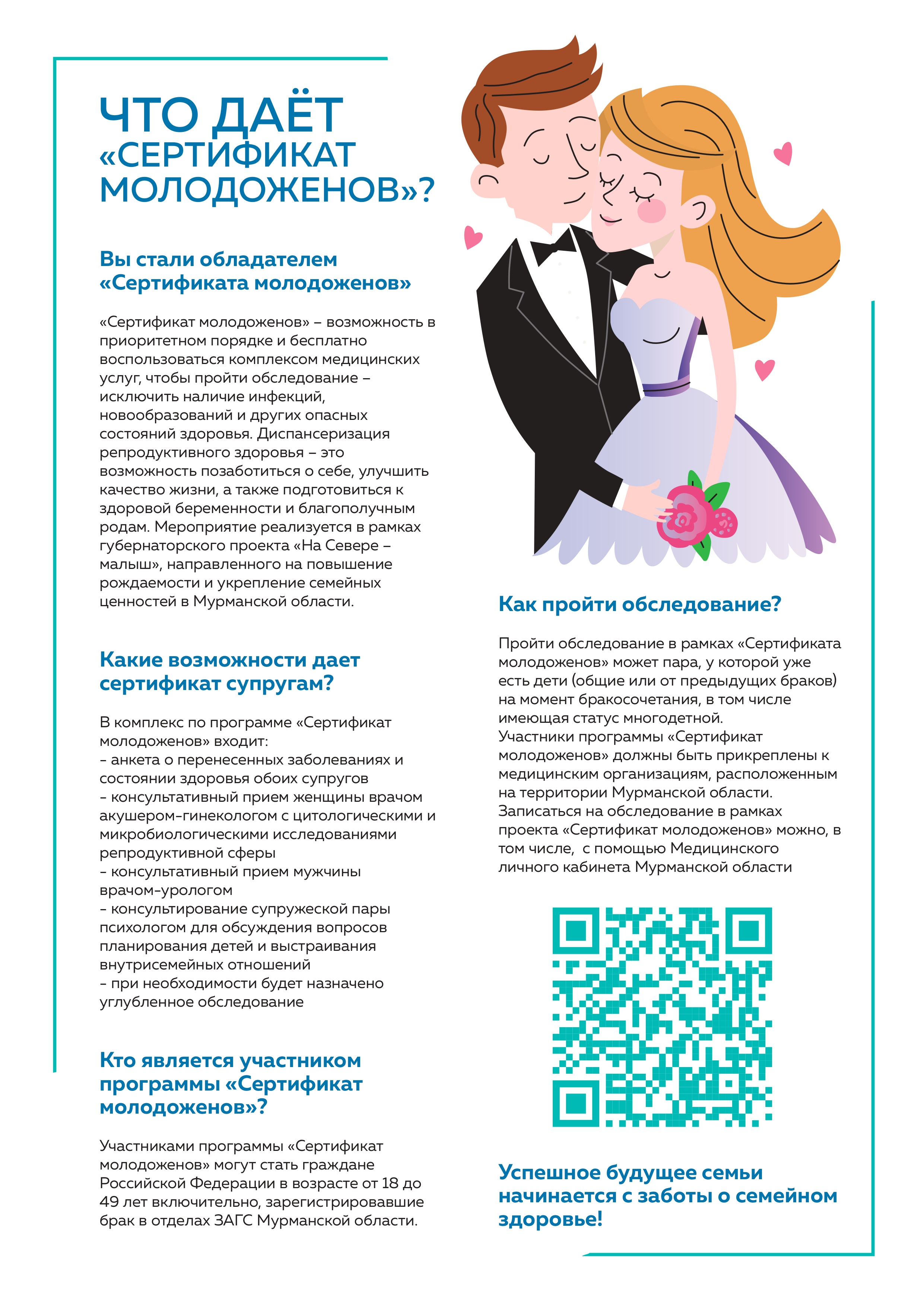 Помочь в этом может «Сертификат молодоженов», который в приоритетном порядке дает возможность воспользоваться комплексом медицинских услуг для проверки репродуктивного здоровья.